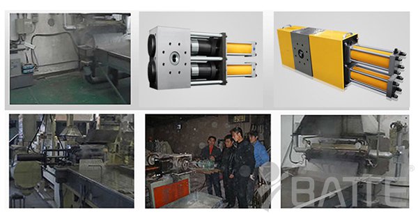 (2)小型的拉條冷切造粒工藝一般都用多網往復過濾的換網器(如:可采用雙柱四工位液壓換網器、雙柱四工位反沖洗液壓換網器),因為它帶穩壓及自動排氣機構,換網時不停機、不斷條、不影響正常生產,粒子光滑無氣泡。口模與換網器一體化設計制造,合理、經濟、實惠!